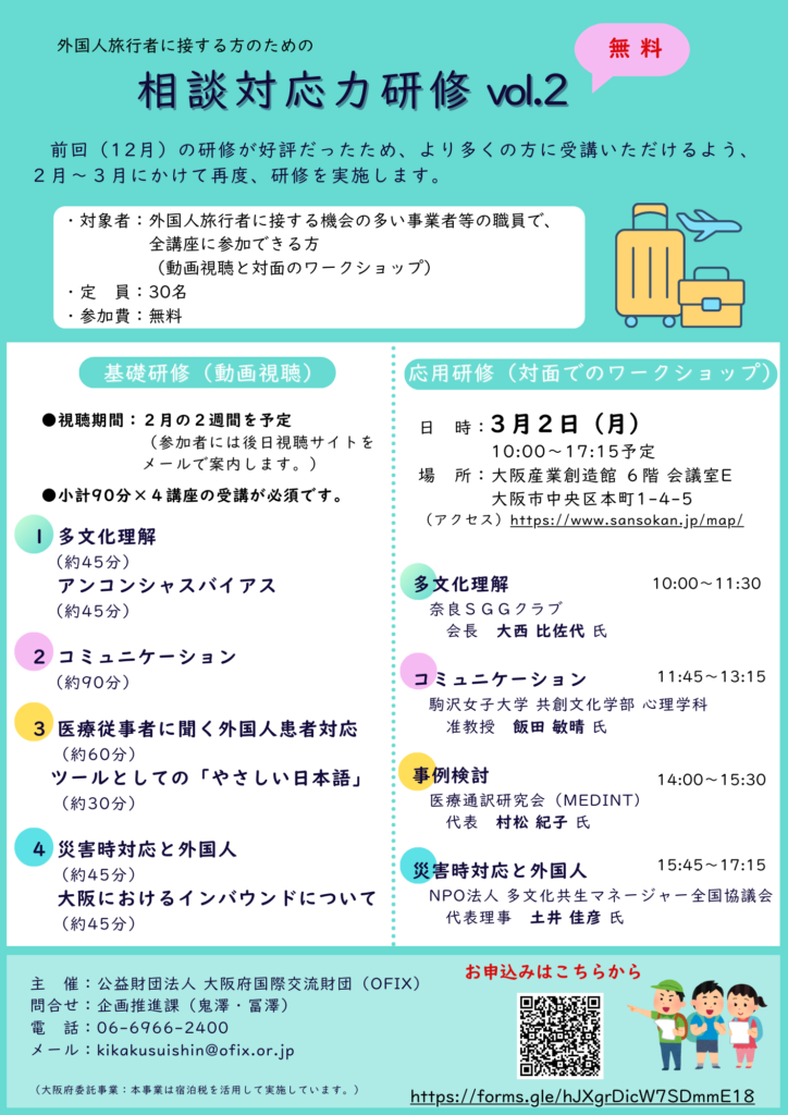 相談対応力研修 vol.2を実施します! イベント 2026.01.222026.01.29 前回(12月)の研修が好評だったため、より多くの方に受講いただけるよう、2月~3月にかけて再度、研修を実施します。ぜひご参加ください。 内 容:基礎研修(動画視聴、6時間)と応用研修(対面でのワークショップ、6時間)対 象:外国人旅行者に接する事業者等の職員定 員:30名参加費:無料申込み:こちらよりお申し込みください。 問合先:企画推進課(担当:鬼澤・冨澤) 06-6966-2400 / kikakusuishin@ofix.or.jp チラシ(PDF)