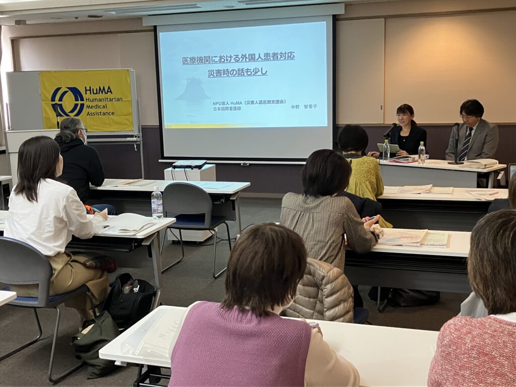 | プログラム内容 | 〇講義 「医療機関における外国人患者対応 災害時の話も少し」 講師:NPO法人災害人道医療支援会(HuMA) 救急救命医 齋藤 研 氏 日本国際看護師 中野 智香子 氏 〇グループワーク ~こんな時どうする~ 「外国人医療」対応を考える 講師:医療通訳研究会(MEDINT) 社会福祉士 代表 村松 紀子 氏 |